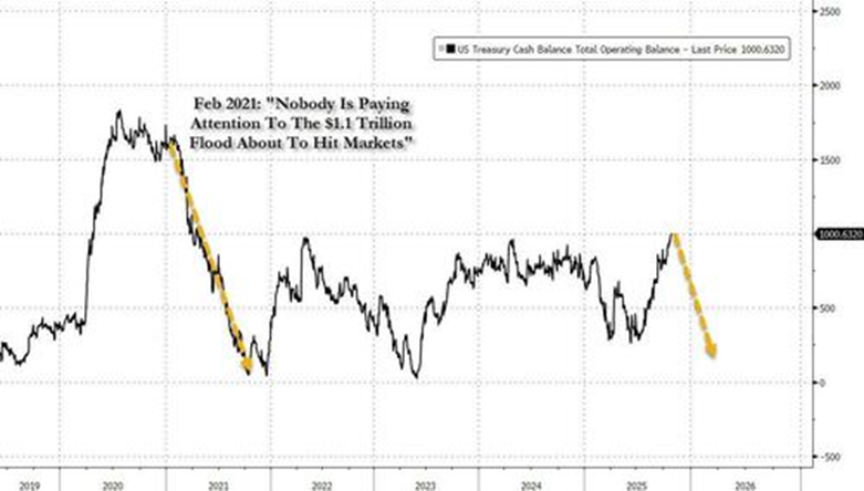 这种流动性释放可能引发对风险资产的大规模抢购。类似情景曾在2021年初上演,当时财政部现金余额的加速消耗相当于"隐形量化宽松",推动股市大幅上涨。2025至2026年可能重现这一剧本。