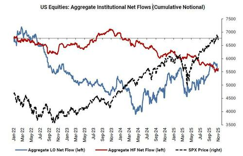 此外,市场仓位数据显示出明显分歧。在过去四周里,长线机构投资者(LOs)持续净卖出,累计规模约80亿美元,而对冲基金(HFs)则在此期间录得18亿美元的净买入。