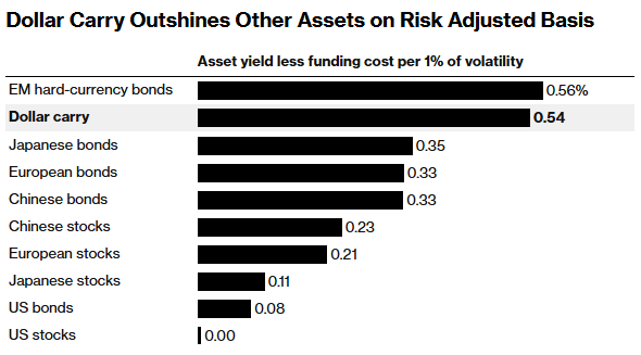 富国银行策略师Aroop Chatterjee表示:“只要宏观经济和金融市场的大环境依然稳健,美元套利交易可能仍会具有吸引力。”