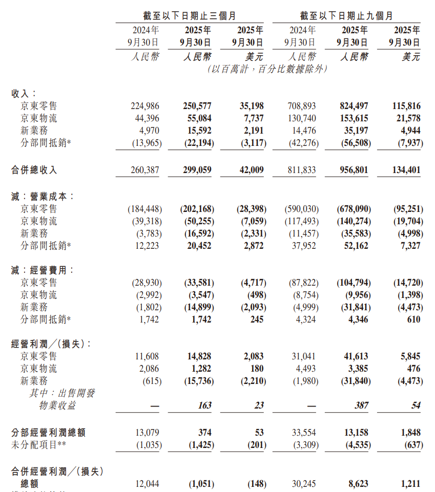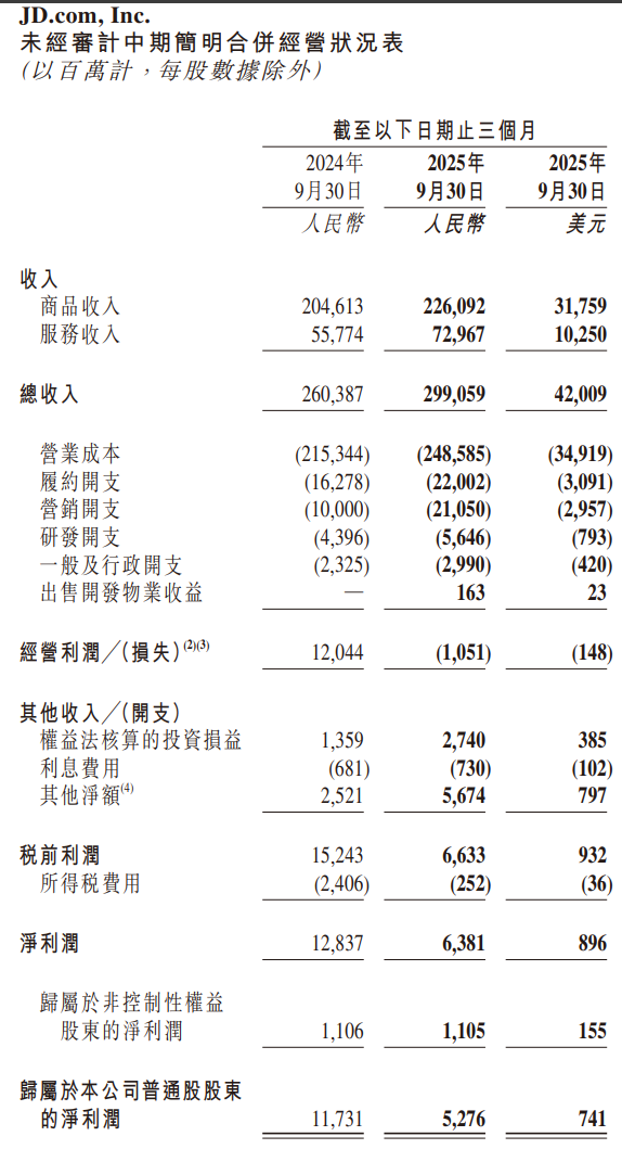 13 日晚间,京东发布了三季度财报,整体收入为 2991 亿元,增长 15%;扣掉营业成本、履约成本、销售管理研发费用之后,经营亏损为 10.5 亿元( 最后净利润为正的 53 亿元主要是因为有 70 多亿的投资收益等非经营所得 )。