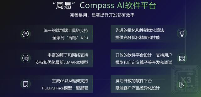 在模型支持方面,“周易”X3支持的算子数量超过160个、支持的模型数量超过270个。在Compass AI软件平台的加持下,开发门槛显著降低,进一步加速“周易”NPU生态的扩展。