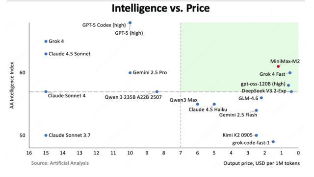 在性能层面,GPT-5的两个版本虽领先市场,但其token成本却远远落后;而在成本与性能综合领先的第一象限,MiniMax的M2与Grok 4 Fast难分伯仲。
