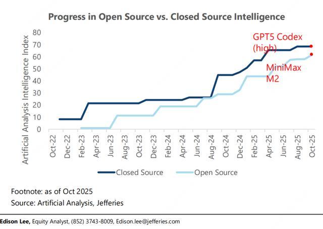 就在11月,杰富瑞(Jefferies)在报告《全球语境下的中国人工智能》(China AI in a Global Context)中指出:2023 至 2025 年间,中国主要云厂商的资本开支总额为 1240 亿美元,比美国同行少了 82%,但中国最先进的大模型如 MiniMax M2 的性能,仅比美国最强的 模型如GPT-5 落后约 10%。