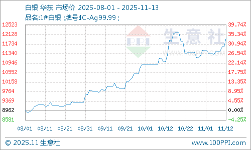 据生意社商品行情分析系统,2025年11月13日白银市场均价12420元/千克,较本月初(11月1日)白银市场均价11476元/千克,上涨8.23%再创历史新高。