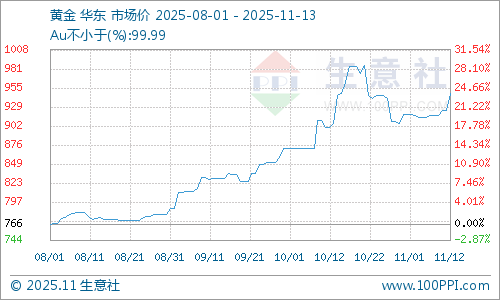 据生意社商品行情分析系统,截止2025年11月13日黄金现货早盘市场价格957.69元/克,较本月初(11月1日)黄金现货市场价格918.62元/克,上涨4.25%。