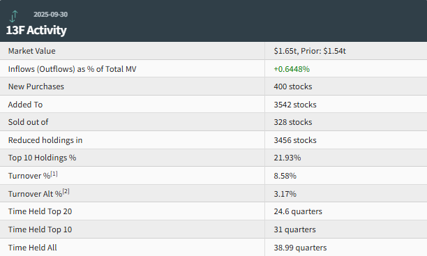 据统计,摩根士丹利第三季度持仓总市值为1.65万亿美元,上一季度总市值为1.54万亿美元,环比上升7.1%。该基金在第三季度的投资组合中新增了400只个股,增持了3542只个股,减持了3456只个股,清仓了328只个股。其中前十大持仓标的占总市值的21.93%。