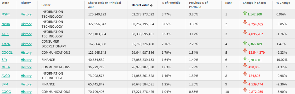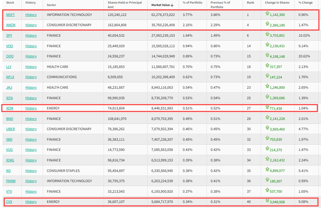 在前五大重仓股中,微软(MSFT.US)位列第一,持仓1.20亿股,持仓市值约622.8亿美元,占投资组合比例为3.77%,较上季度持仓数量增加0.96%。