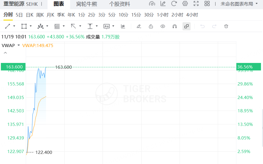 11月19日,氢能概念股全线走高,重塑能源涨超36%,国富氢能涨近10%,亿华通涨超4%。