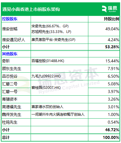 招股书显示,遇见小面在上市前的股东架构中,控股股东宋奇先生、苏旭翔先生、淮安创韬、淮安遇见好人等,合计持股约53.28%。