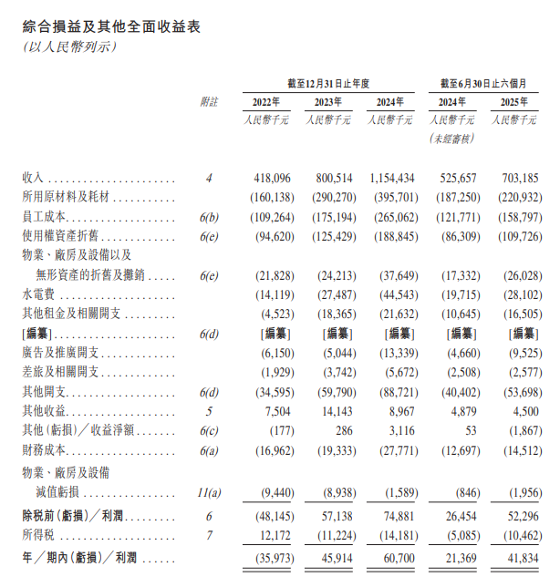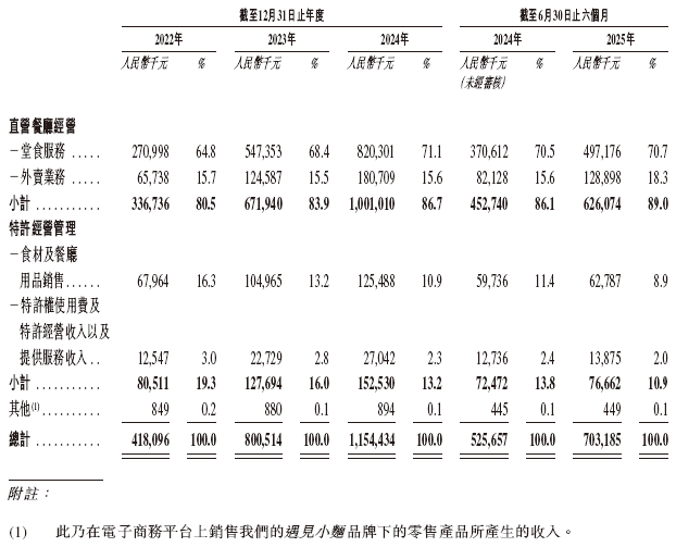 招股书显示,在过去的2022年、2023年、2024年和2025年前六个月,遇见小面的营业收入分别为人民币4.18亿、8.01亿、11.54亿和7.03亿元,相应的净利润分别为人民币-3,597.3万、4,591.4万、6,070.0万和4,183.4万元。