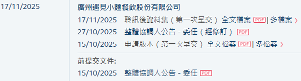 2025年11月17日,来自广东广州的广州遇见小面餐饮股份有限公司Guangzhou Xiao Noodles Catering Management Co., Ltd.(以下简称“遇见小面”),在港交所披露聆讯后的招股书,或很快香港主板IPO上市。其于2025年4月15日、2025年10月15日先后两次递表。