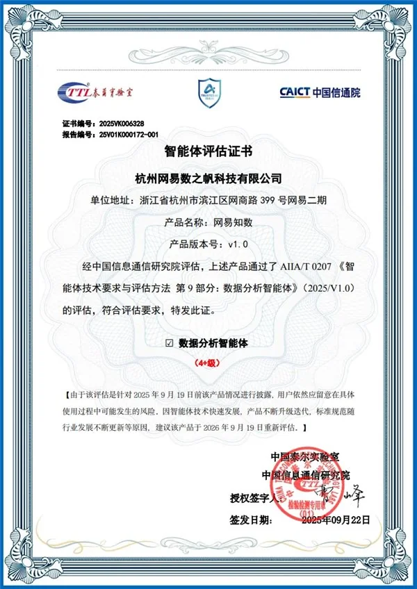 封雷表示,在今天网易知数正式发布之前,这款产品就已经经历了层层严苛的考验。前不久,中国信通院依据《智能体技术要求与评估方法第 9 部分:数据分析智能体》,围绕智能体技术能力、场景能力和服务成熟度三大维度对网易知数进行了细致全面的评估,最终网易知数通过了中国信通院可信 AI 智能体评估。