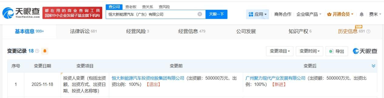 天眼查工商信息显示,近日,恒大智能汽车(广东)有限公司、恒大新能源汽车(广东)有限公司发生工商变更,原股东恒大新能源汽车投资控股集团有限公司退出,新增广州聚力现代产业发展有限公司为全资股东。