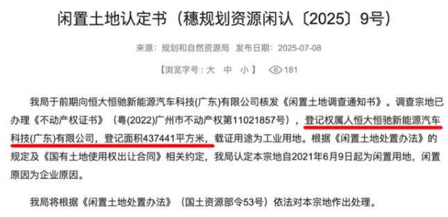 此前,恒大汽车广州南沙区土地已被收回。今年7月8日,广州市规划和自然资源局官网公示了一则《闲置土地认定书》(穗规划资源闲认〔2025〕9号)。
