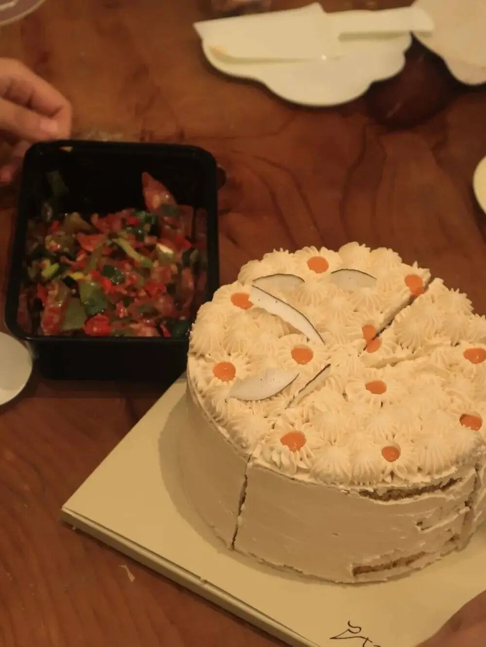用3个小时吃了几乎的蛋糕,说不腻是假的。当品尝到第五六款时,甜腻感逐渐累积,大家都有点吃不动了。没想到,一位参与者从包里拿出了中午打包的炒腊肉,咸香的气息瞬间“解救”了被糖分包围的众人。