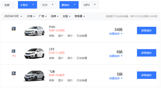昔日“国民神车”本田飞度,10月份在燃油小型车市场中排名位列第三。