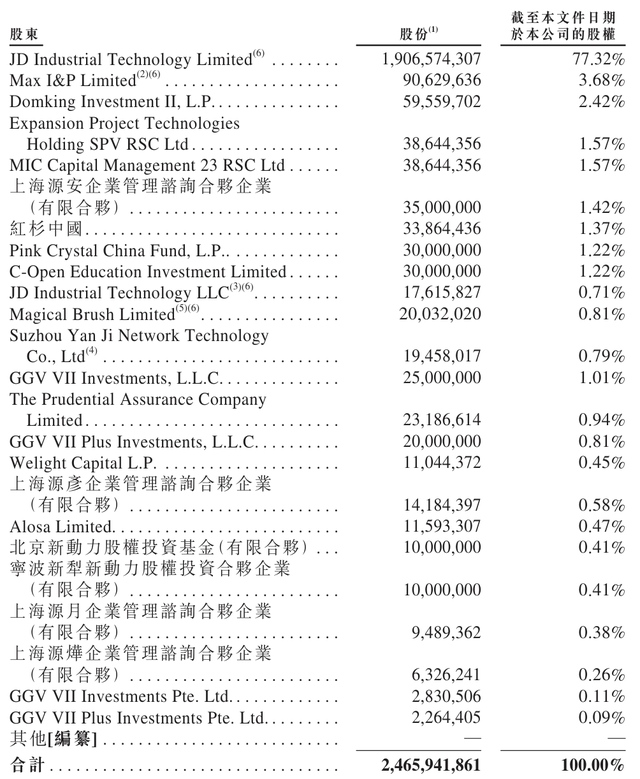 JD Industrial Technology持股0.71%,Magical Brush持股0.81%,Suzhou Yan Ji持股0.79%,GGV VII Investments持股1.01%,The Prudential Assurance Company持股0.94%,GGV VII Plus持股为0.81%,WelightCapital持股为0.45%,上海源彦企业管理咨询合伙企业持股为0.58%,Alosa Limited持股为0.47%;