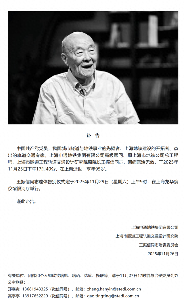 我国城市隧道与地铁事业的先驱者王振信逝世,享年95岁