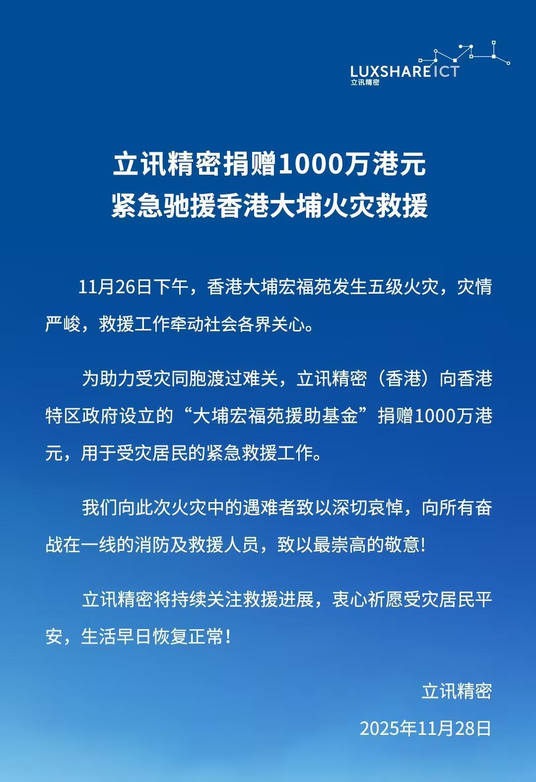 凤凰网科技讯 11月28日,立讯精密(香港)向香港特区政府设立的“大埔宏福苑援助基金”捐赠1000万港元,用于受灾居民的紧急救援工作。