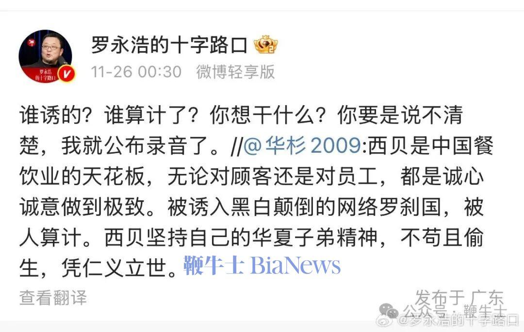 华杉称西贝被人算计,暗示罗永浩是罗刹国。
