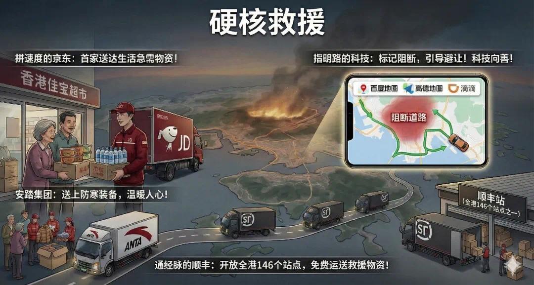通经脉的顺丰: 捐钱不说,还开放了全港146个站点免费运送救援物资。这叫啥?这叫打通了救援的“毛细血管”!