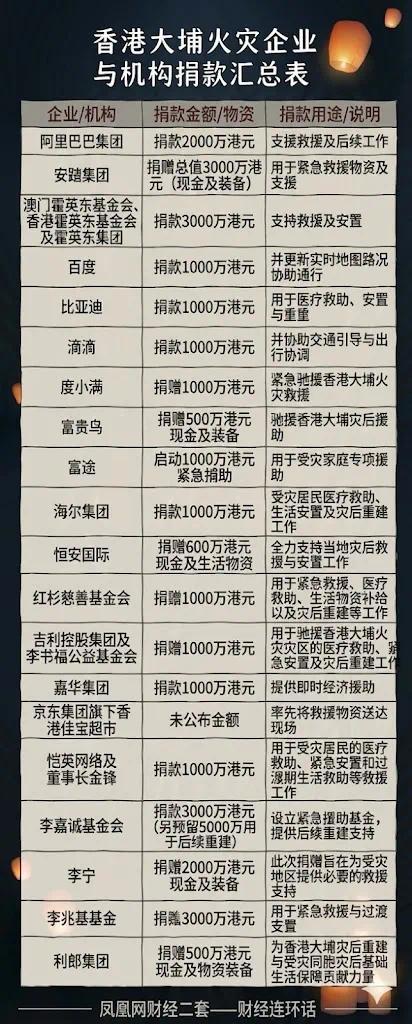 阿里系(共6000万港元): 马云公益基金会(3000万)+阿里巴巴集团(2000万)+蚂蚁集团(1000万)。(阿里系这次真的是大手笔,不仅给钱,支付宝HK还开了捐款通道,方便大家献爱心。)