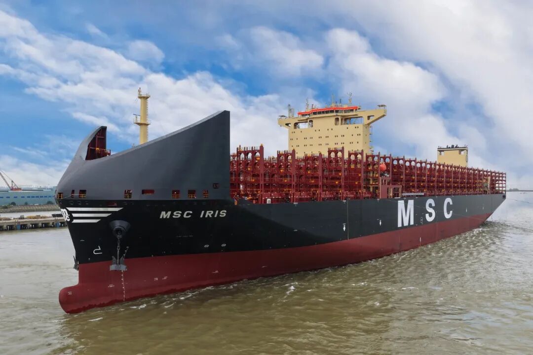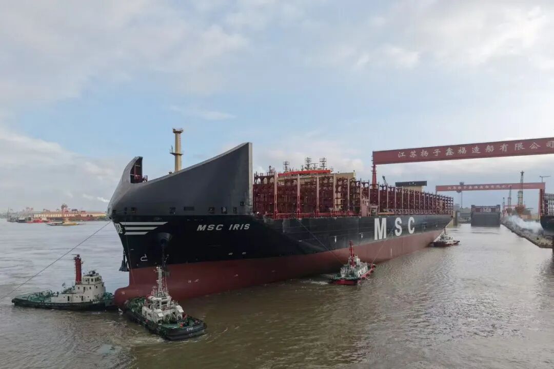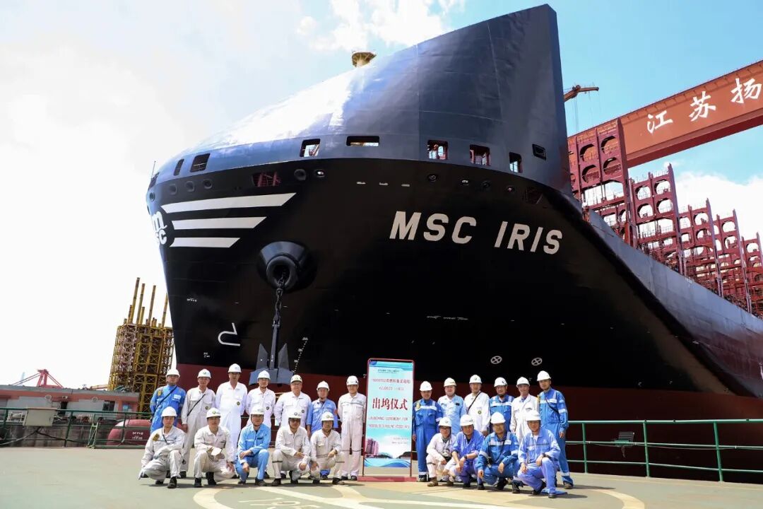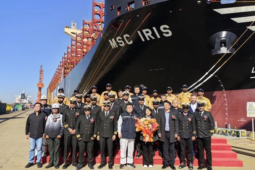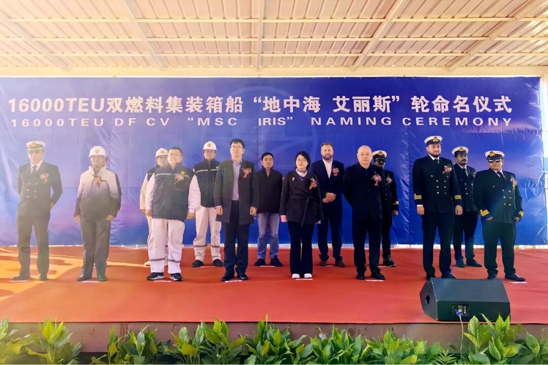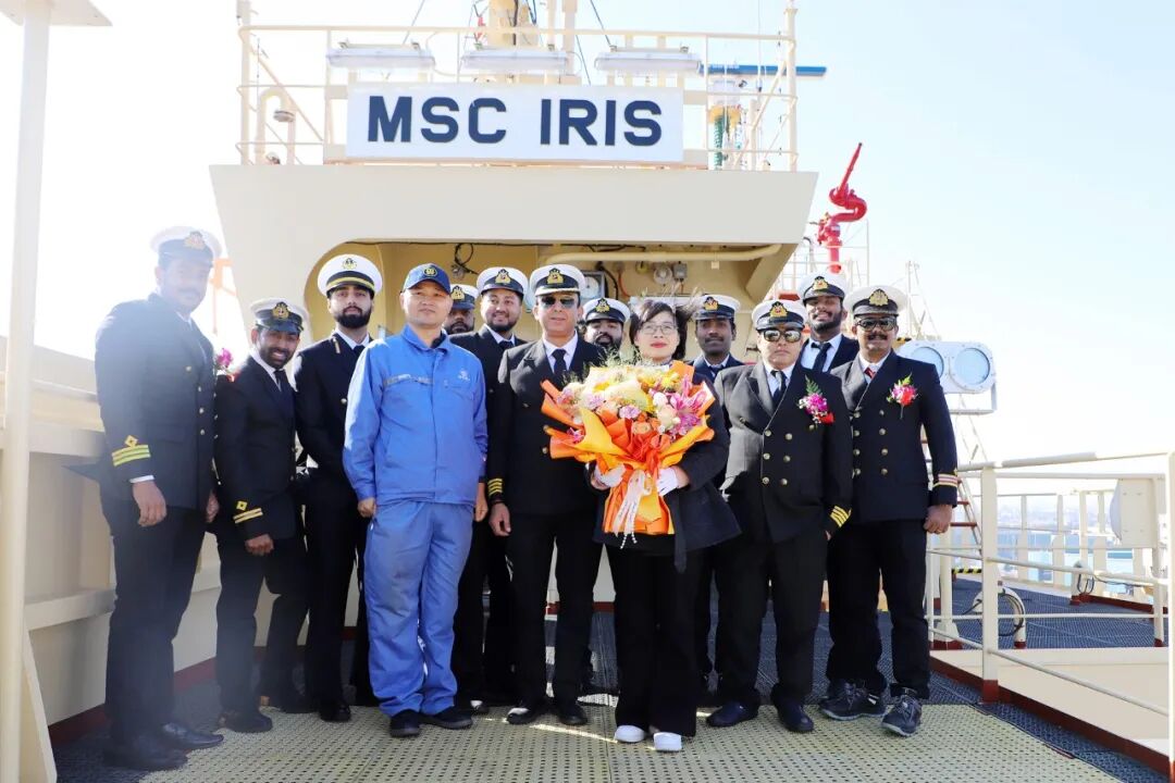 命名人陈红女士将新船命名为“MSC IRIS”轮,为新船砍缆、掷香槟礼、拉响汽笛,并与船长共同在新船画框上署名留念,祝福随船船员航行平安,为船东和租家带来荣誉和财富。