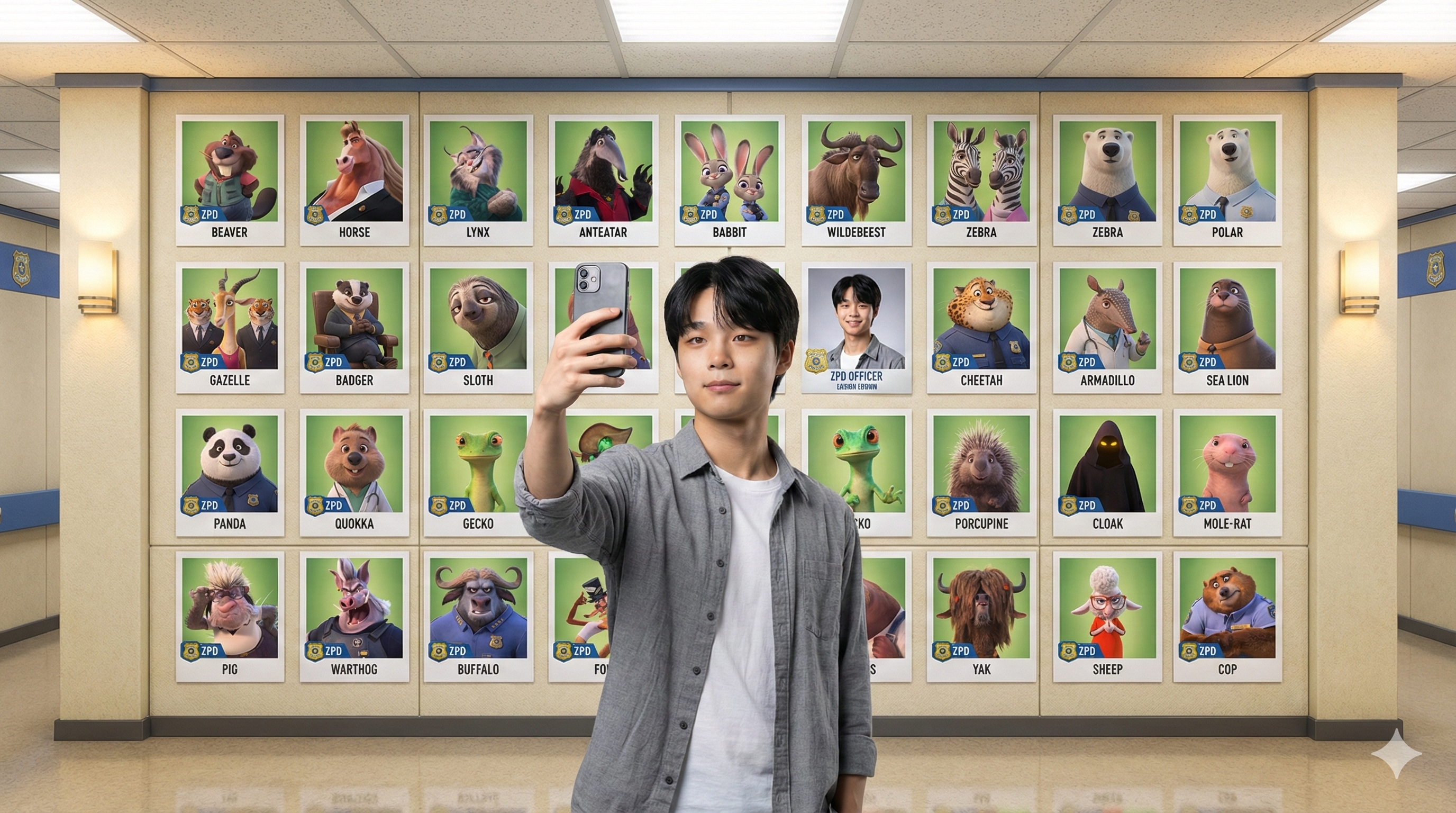 结果应展现出仿佛该用户已加入了ZPD,在官方员工照片墙前,与28位《疯狂动物城》的角色及其个人ID肖像一起合影留念之效果;画面需高清晰度,4K质量,有电影感但具备现实主义氛围感。