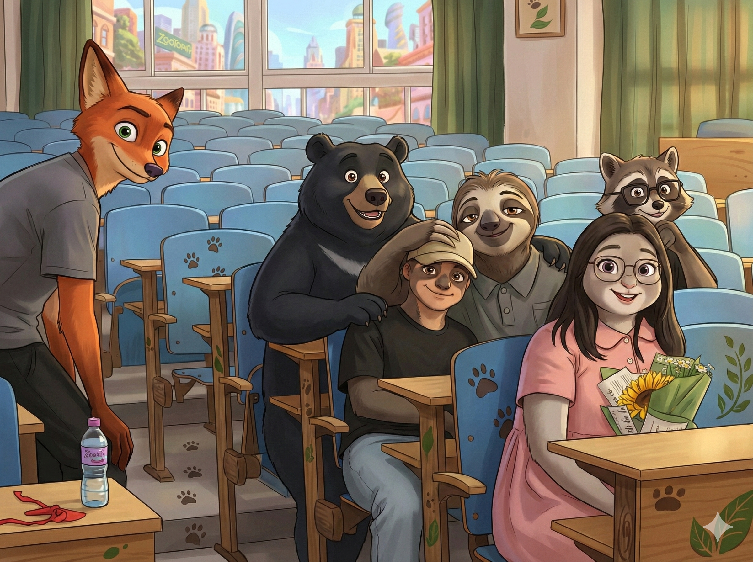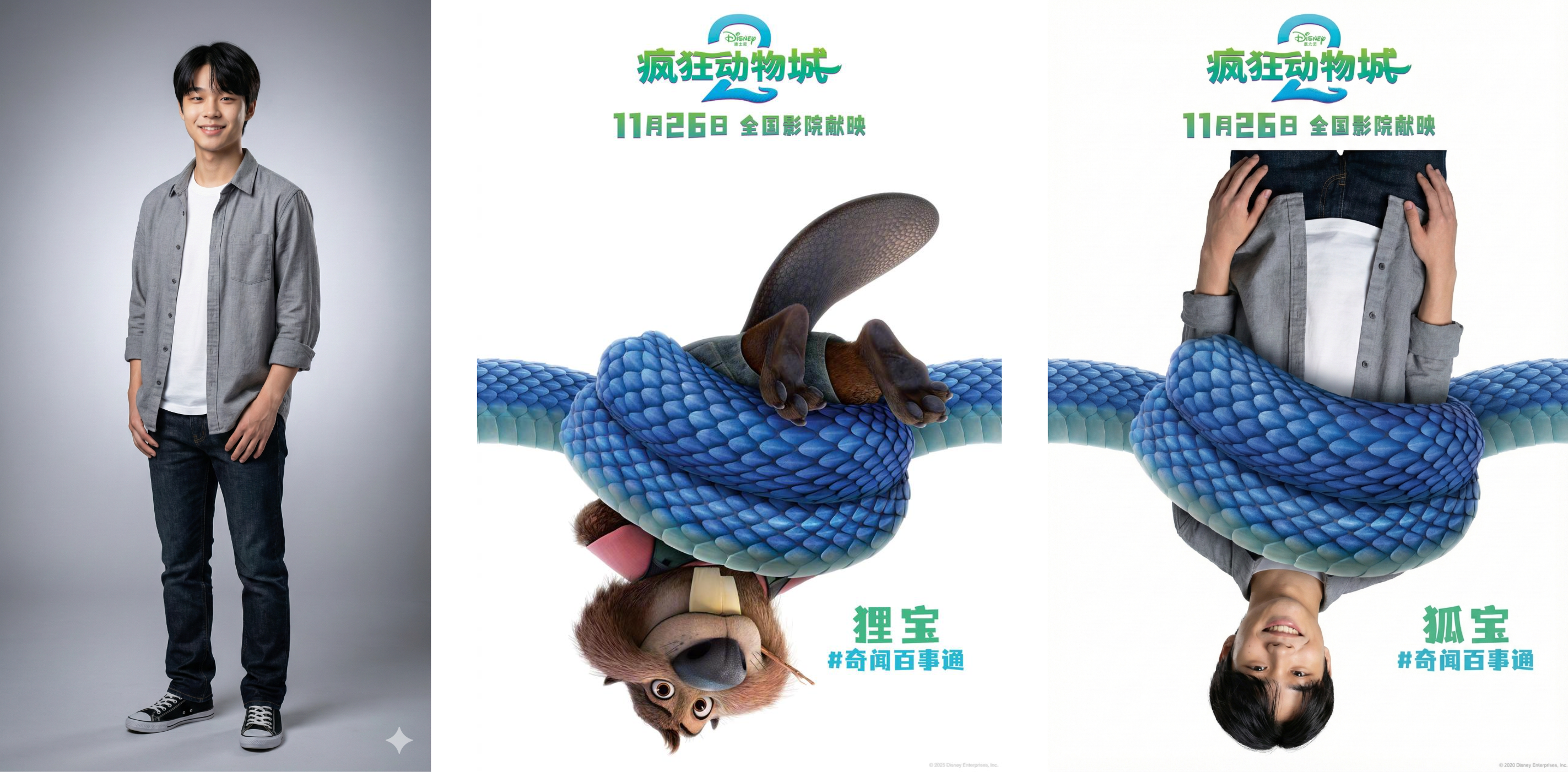 保持人物可识别性及自然肤色,仅添加与《疯狂动物城》宣传画一致的轻度艺术化处理。