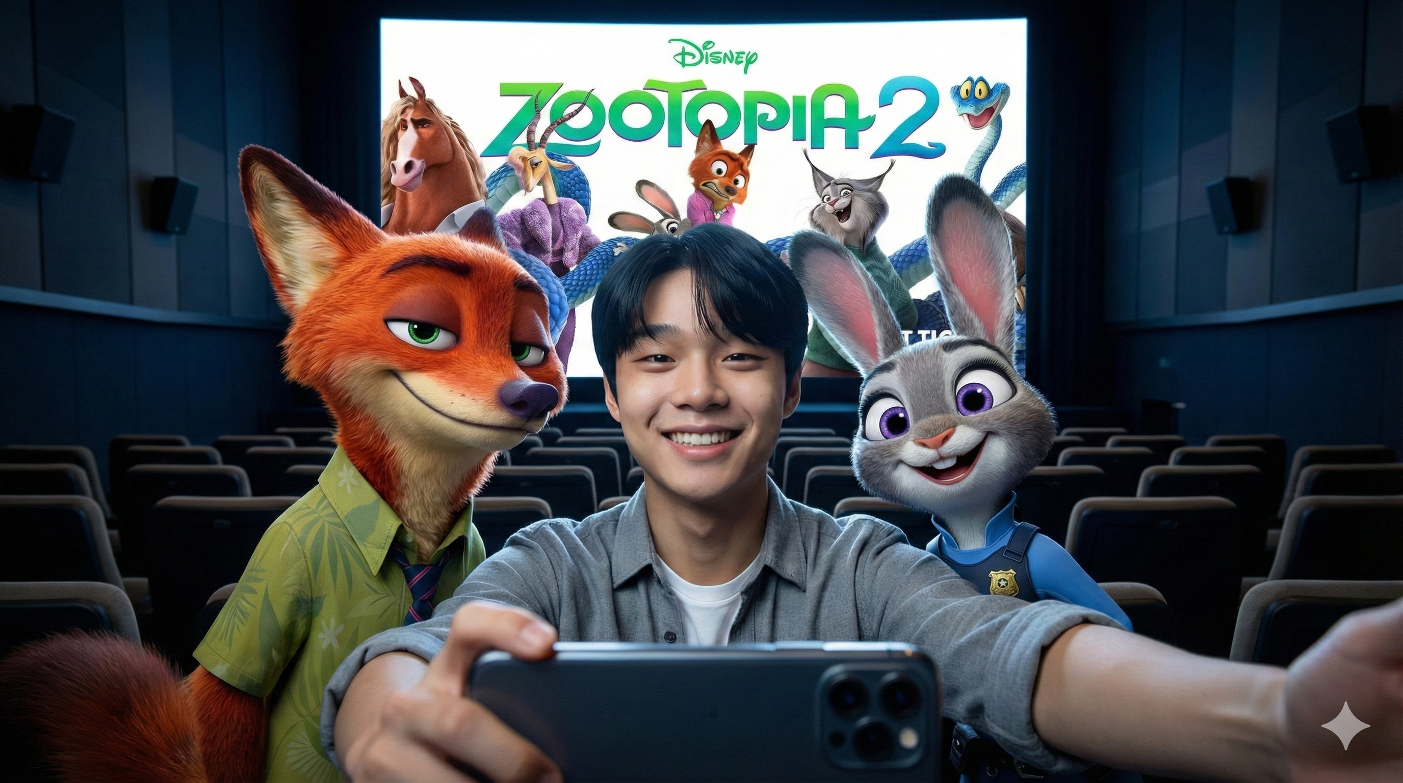 ▲提示词:把这个男生和另外两个疯狂动物城角色放到一张合照里,他们就像是拿着手机在自拍,背景是电影院,电影院的屏幕上显示着我发给你疯狂动物城海报;16:9 的大小,4K 画质。
