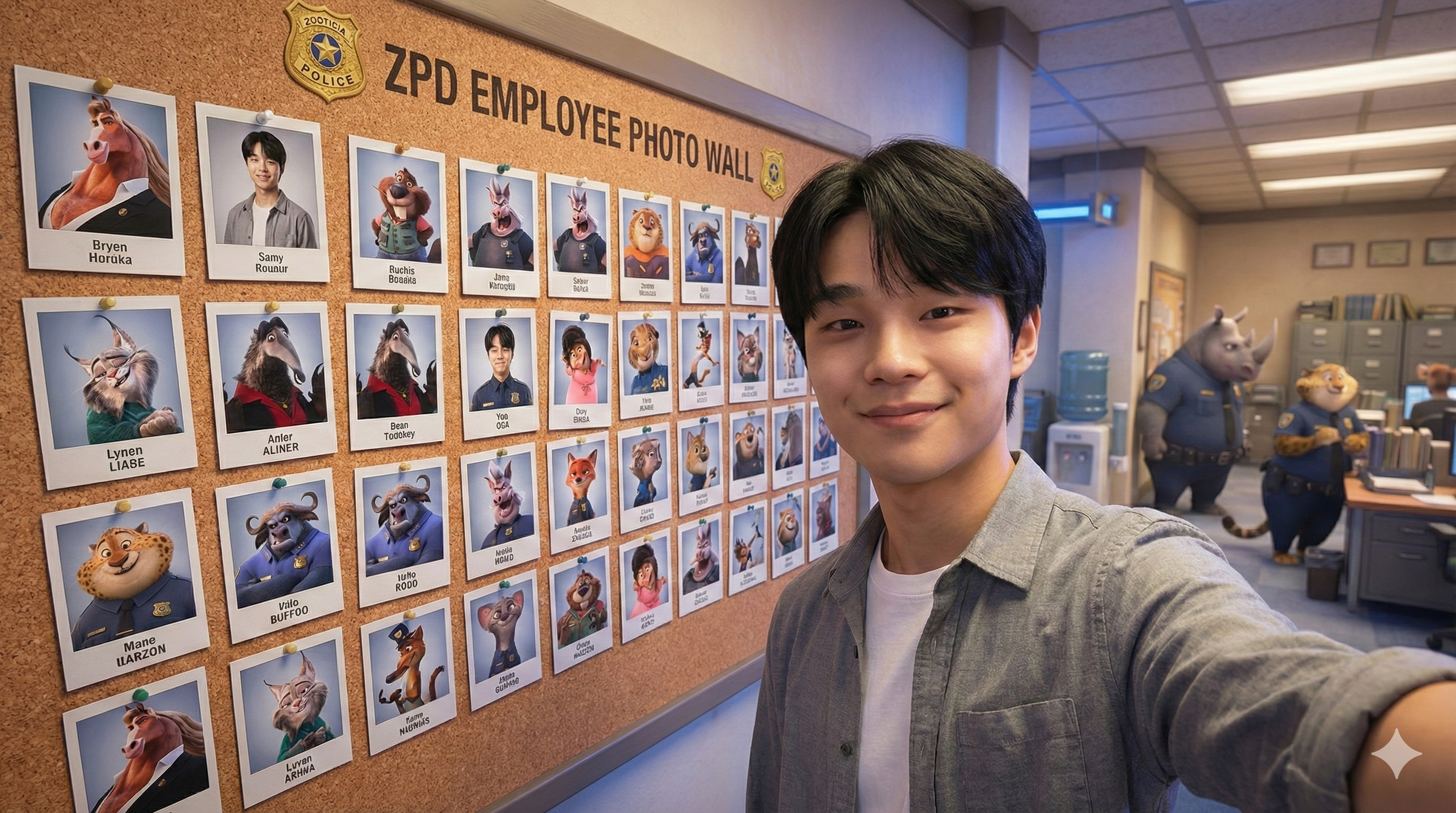 有了这么多的角色图片,我们还可以做一张疯狂动物城警局的照片墙,Judy、Nick、Bogo、Clawhauser 都在那块墙上,然后我们上传的照片也被贴到同一块墙上。