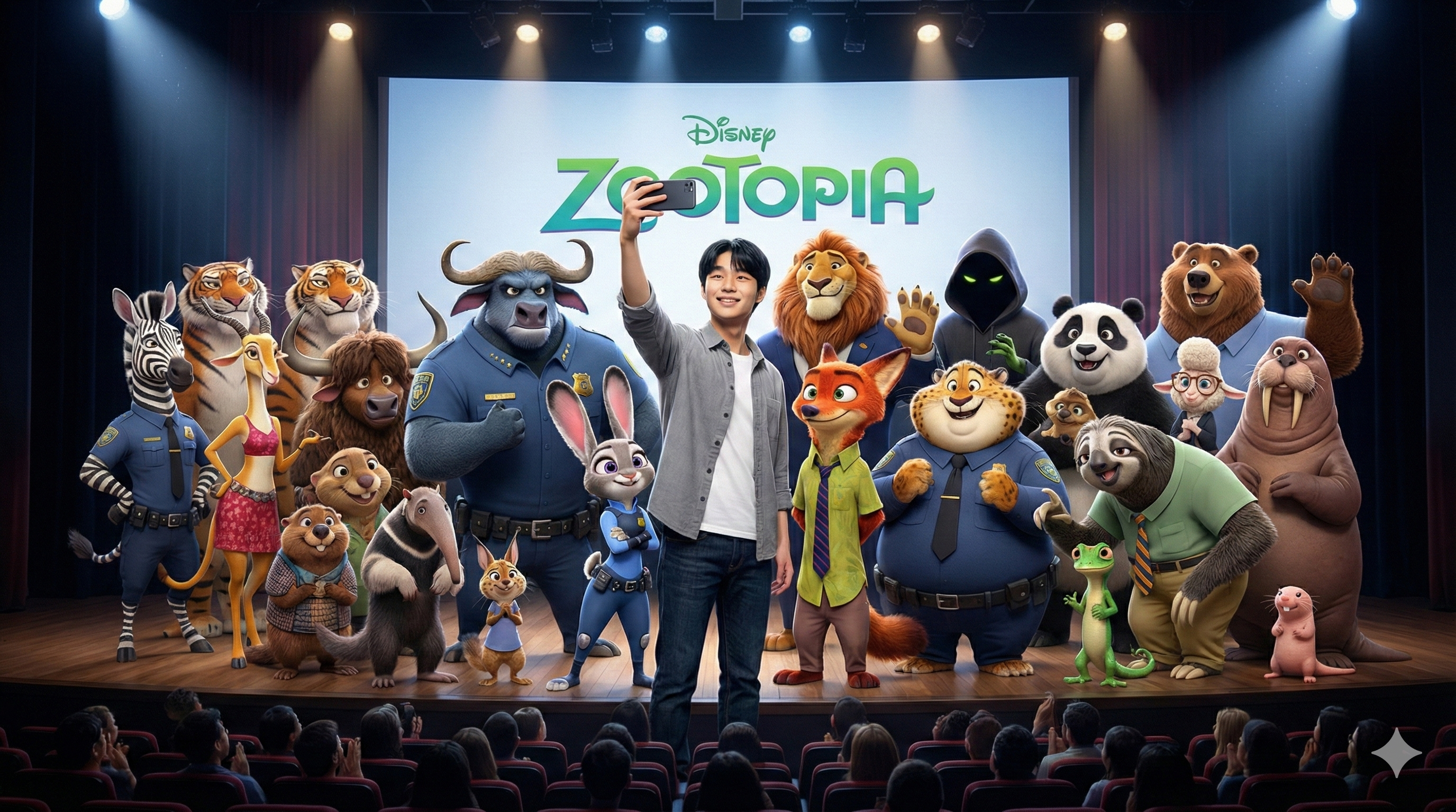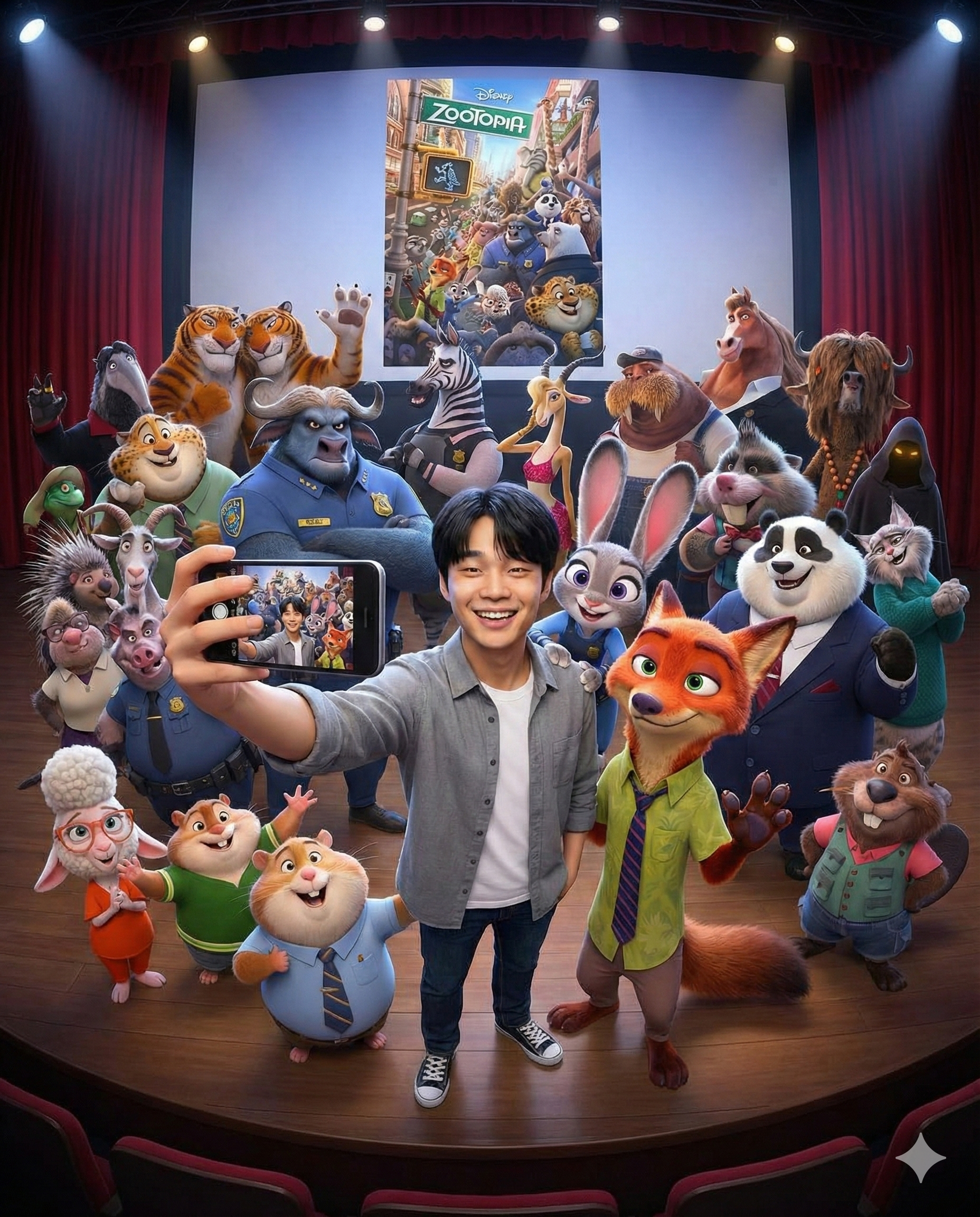提示词:图一是我,图2到图8,每张图片里面有4个疯狂动物城里面的角色,现在你需要把我和他们放在一张合照里面,就像是在线下的电影院,这些电影角色主创都在台上,我和他们一起合照,我在中间,拿着手机自拍,然后他们都在我旁边或者身后。