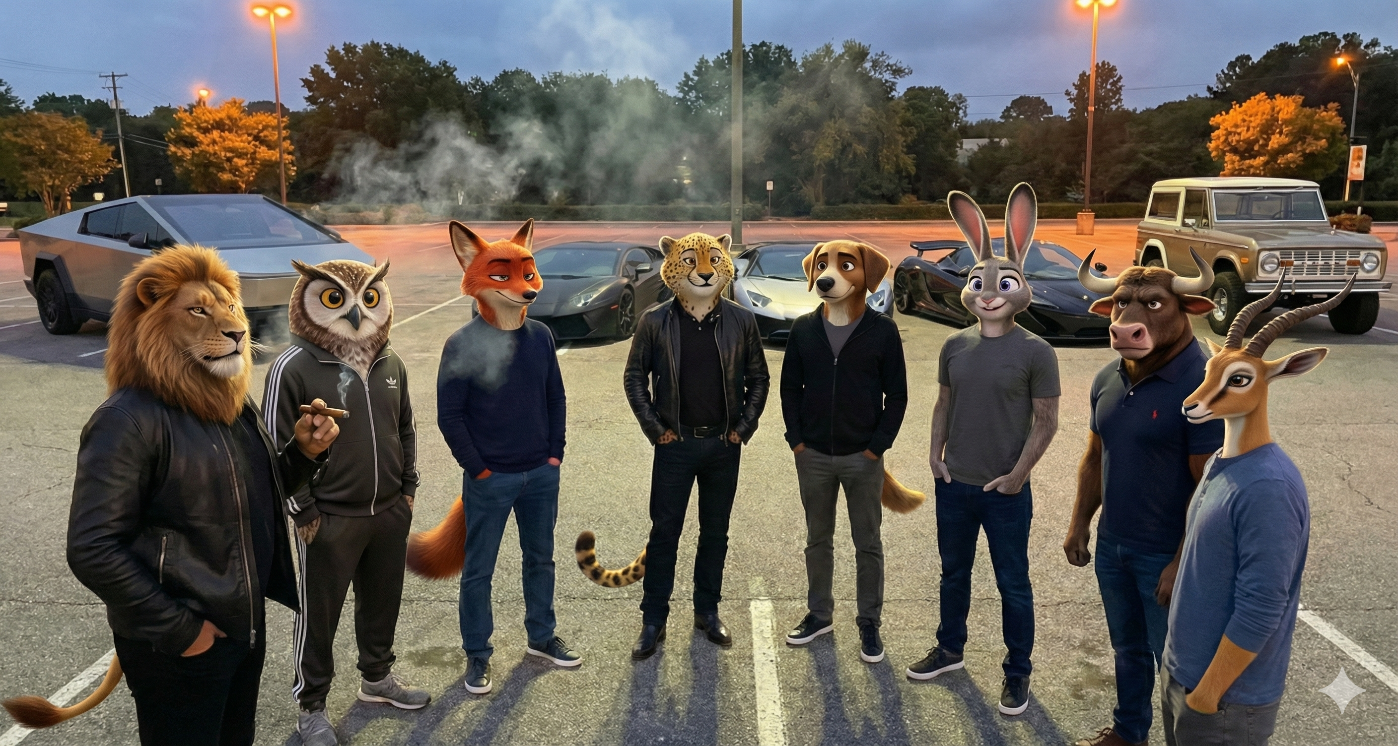 拿着这套提示词,几乎可以把所有的照片,都转成这种现实+疯狂动物城的风格。还记得我们之前 AI DONE 活动预告里面,4 位 AI 大佬走在斑马线上吗,现在你还能不能,分辨出从左到右都是谁。