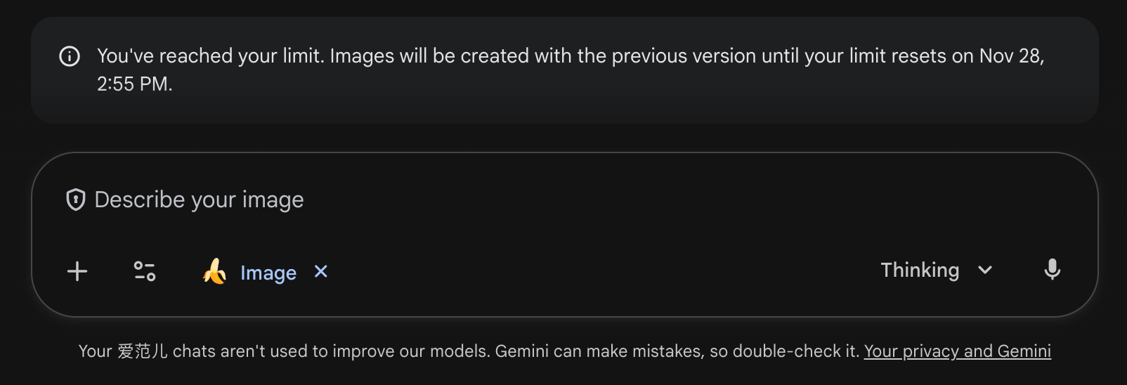 Gemini 使用 Nano Banana Pro 的次数是有限制,在部分时候会像 ChatGPT 一样,弹出使用旧模型的提示。