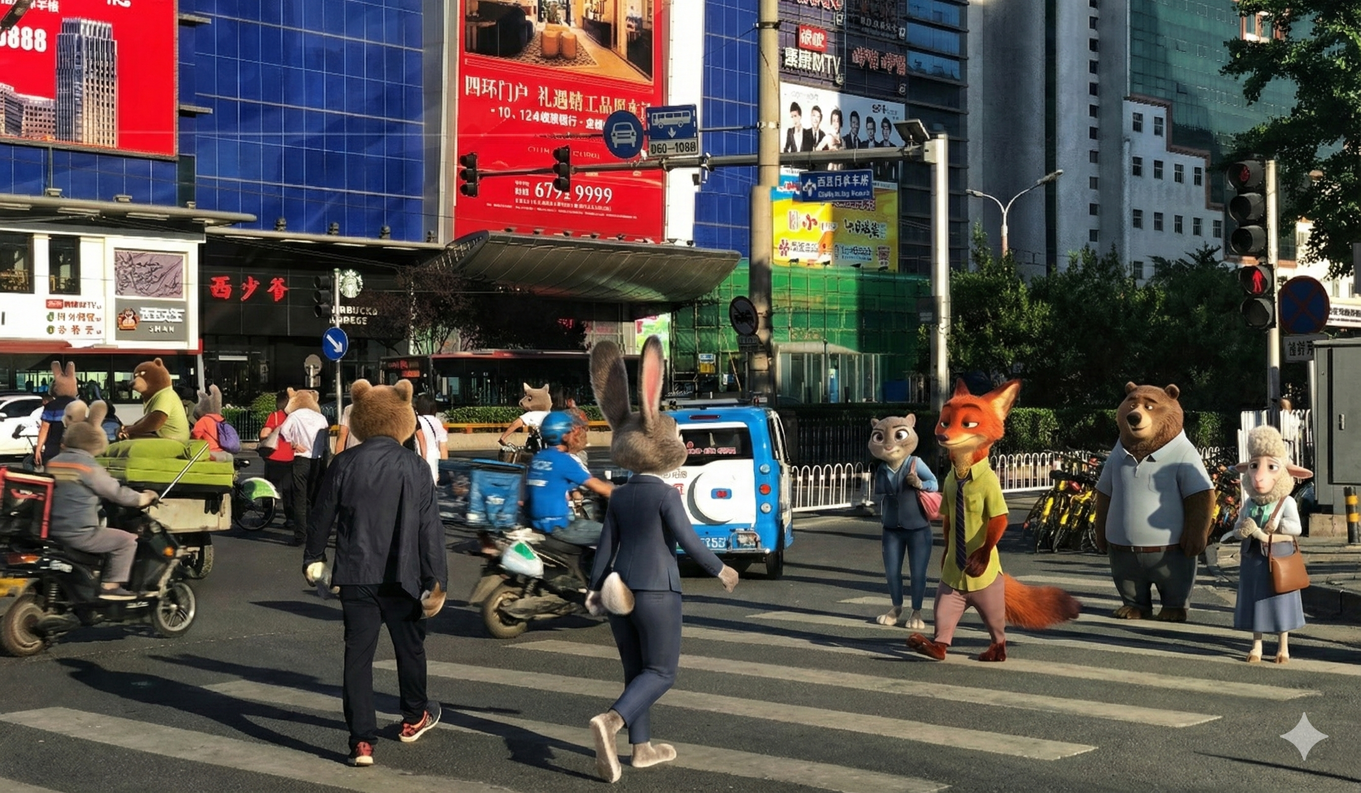 把开头那张只是转换了路上行人的照片,全部换成疯狂动物城的元素,色彩更加鲜艳,元素也更协调。