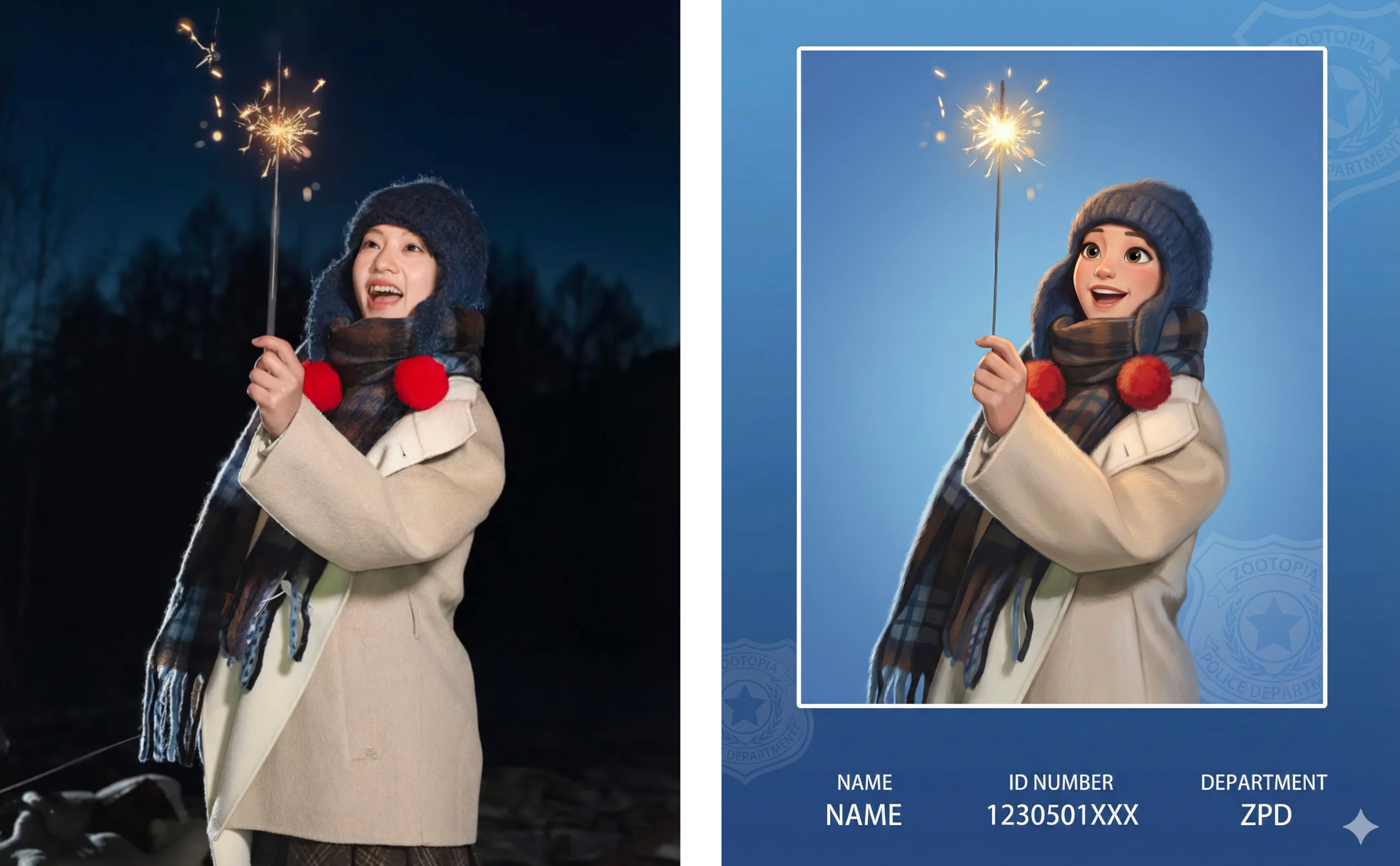 除了合照的玩法,配合新升级的 Nano Banana Pro,我们还有很多疯狂动物城2 联动玩法。