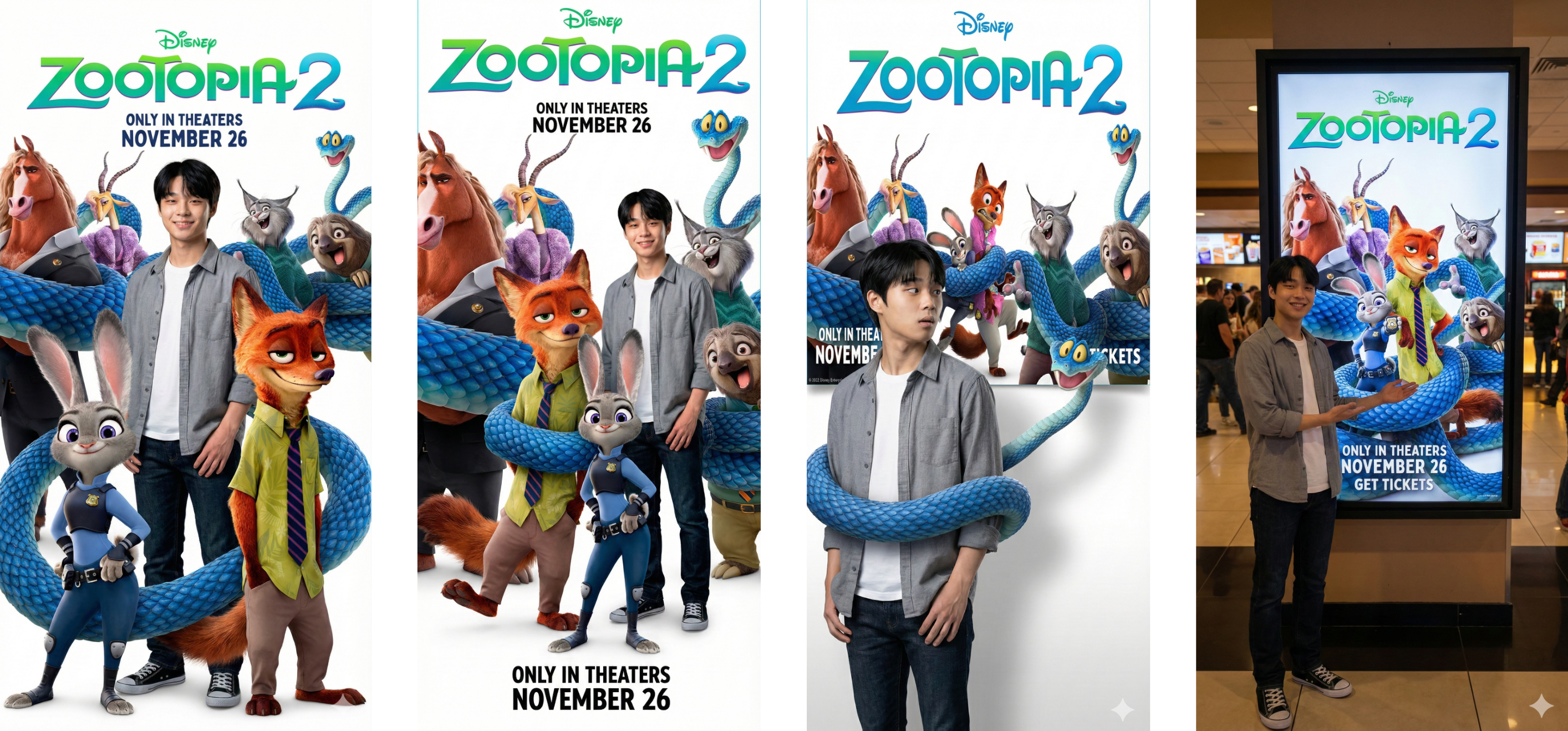照片里的网友,左拥右抱着兔朱迪和狐尼克,作出自拍的姿势,而背后的影院屏幕上还显示着疯狂动物城2 的海报。同时人脸的一致性保持,让人觉得这就是电影放映后的粉丝福利,动画片主角跑出来免费合影。