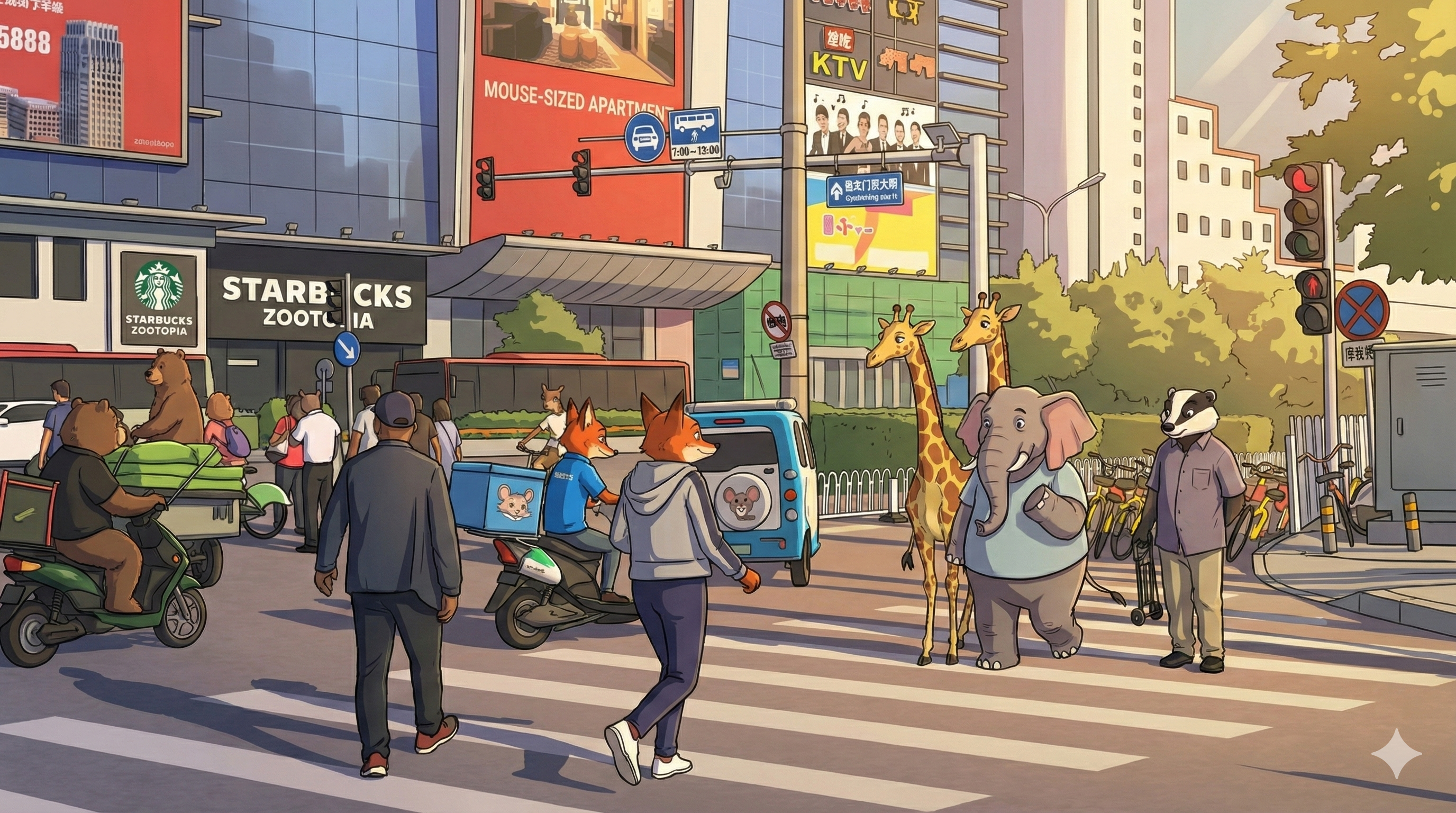 提示词:将这个现实世界的照片转换为《疯狂动物城》风格的动物城市,保留原始图片原始的全部元素和布局结构,但转换为风格化的拟人化基础设施,4K 画质。