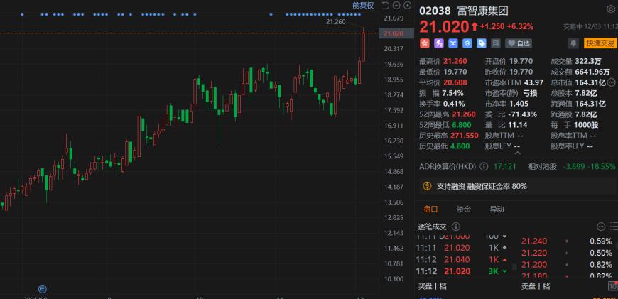 12月3日,富智康集团(2038.HK)逆势拉升涨超6%,最高报21.26港元创2019年4月以来新高,总市值164亿港元。