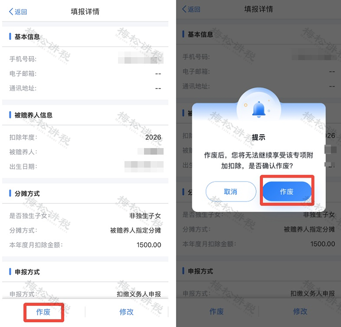 纳税人可以在确认之后在APP中点击【首页】,选择【专项附加扣除填报】,选择【扣除年度2026】,查看已提交信息。若有变动,则可以选择作废或修改。