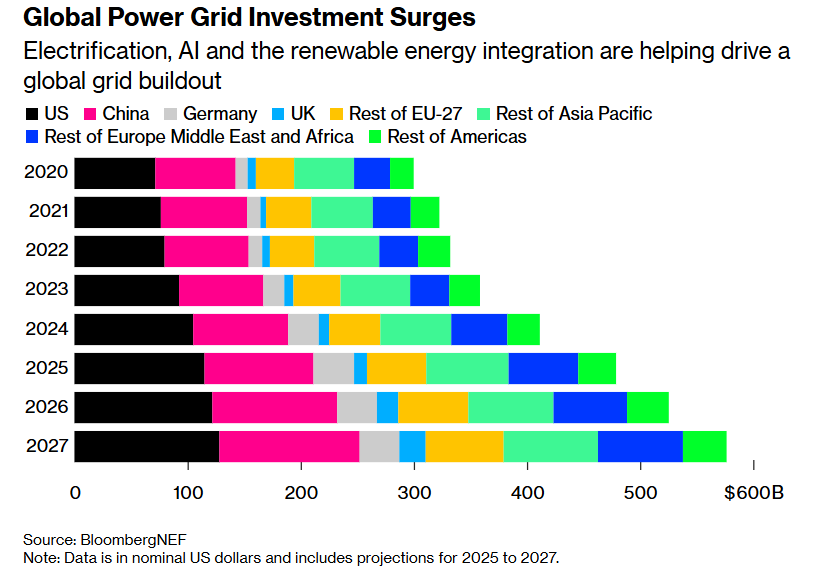正如上述图表所示,全球范围电网投资规模近年来激增——尤其是电气化、AI以及可再生能源体系的大规模并网正共同推动全球电网建设。