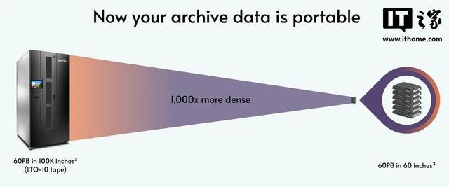存储密度是 DNA 存储另一大优势。Atlas 特别指出,其归档解决方案可在 60 立方英寸(约合 983 毫升,略小于 1 升)的空间内存储高达 60PB(拍字节)的数据。其宣传图示显示,这相当于六盘药丸大小的胶囊所占体积。这一密度都意味着:若使用 LTO-10 磁带存储同等容量的数据,所需空间约为 Eon 100 系统的 1000 倍。