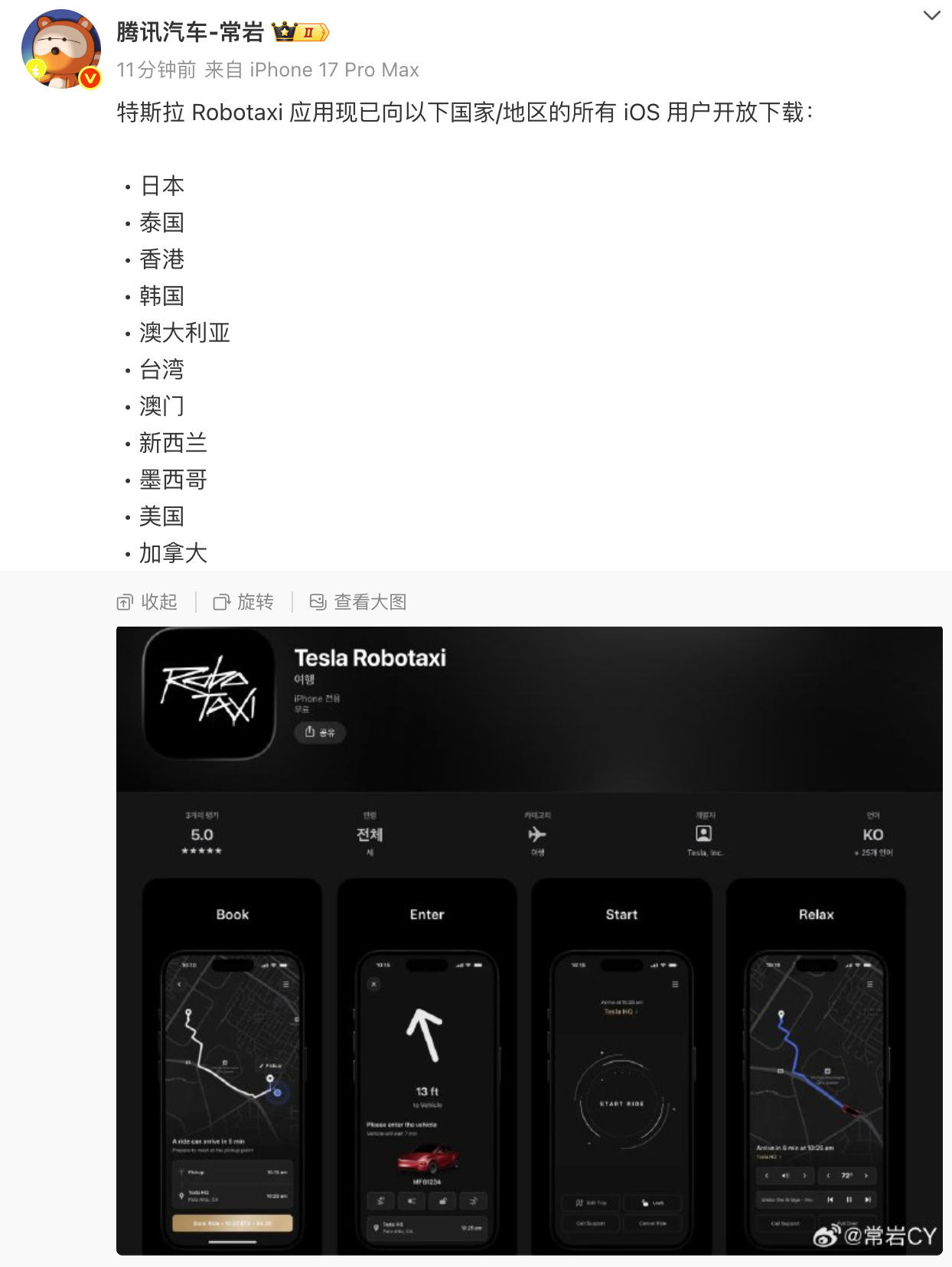 凤凰网科技讯 12月7日,据博主@常岩CY 消息,特斯拉近日在多地同步推进自动驾驶出行服务布局,其Robotaxi官方应用现已面向美国、日本、泰国、韩国、澳大利亚8个国家以及中国港澳台地区的所有iOS用户开放下载。