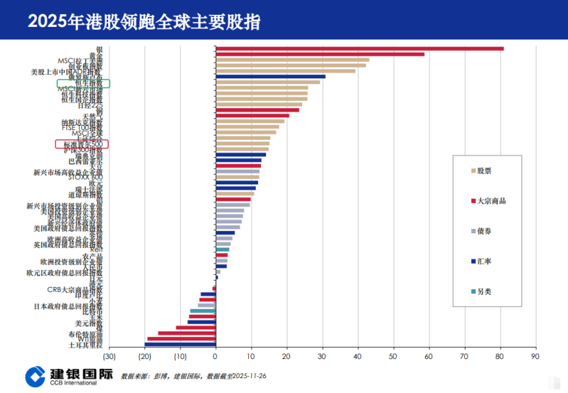 建银国际研报数据显示,截至11月26日,南向交易占港股市场成交额的比例达到47.9%,为港股估值体系的稳定性提供了重要支撑。另外,根据IIF数据,2025年8月中国股票和债券市场合计吸引390亿美元资金流入,占新兴市场总流入规模的八成以上;韩国等海外资金也在持续加仓港股。这种资金流向印证了港股作为全球配置中国资产的核心窗口地位,从“资金洼地”向“价值高地”的演进趋势。而随着港股在全球资本市场中的吸引力逐步提升,一些高质素标再度受到资金追捧,逐步实现“价值回归”。