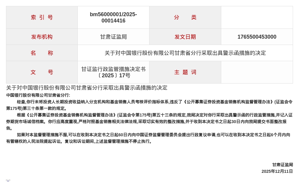 蓝鲸新闻12月12日讯,近日,甘肃证监局发布行政监管措施决定书,剑指中国银行股份有限公司甘肃省分行。