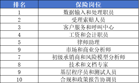 目前来看,AI已经渗透保险业多个核心岗位,宾夕法尼亚大学预测了未来最容易被AI取代的十大工作岗位,分别是数据输入和处理职员、受理索赔人员、客户服务和呼叫中心、会计职员、律师助理、市场和商业分析师、初级承销商和风险模型分析师、技术和文档专家、基层程序员和测试人员、合规和政策报告协调员。