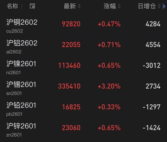 有色金属全线爆发。国内方面,沪锡主力合约涨超3%。国际方面,伦铜、伦锌、伦铅、伦镍均涨超1%。