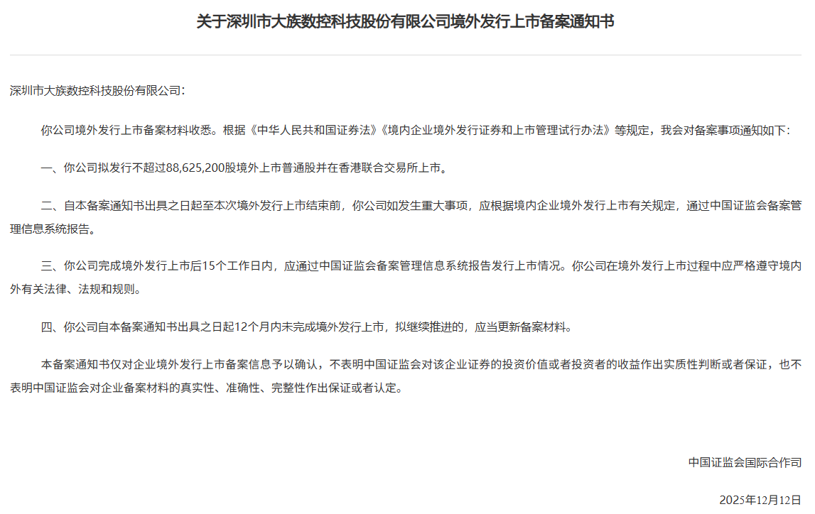 智通财经APP获悉,12月19日,中国证监会国际合作司发布《关于深圳市大族数控科技股份有限公司境外发行上市备案通知书》。大族数控(301200.SZ)拟发行不超过88,625,200股境外上市普通股并在香港联合交易所上市。