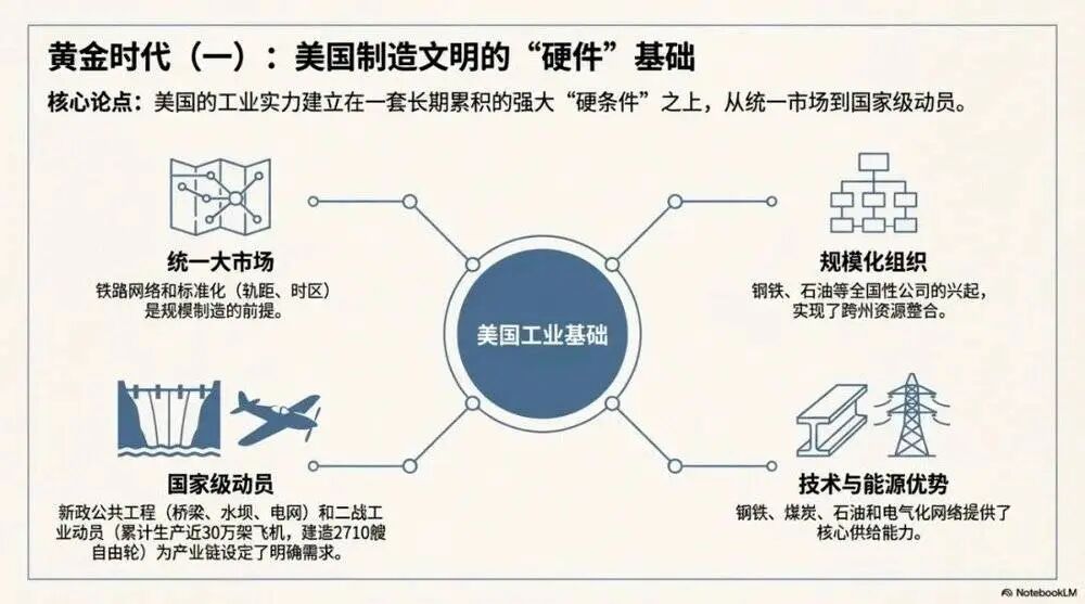 美国制造业的崛起不是一夜之间发生的,它建立在一套长期累积的“硬条件”和“软条件”之上:统一的大市场、稳定的能源与原材料、持续的技术创新、可规模化的企业组织形式,以及在关键时期敢于集中资源办大事的政治动员能力。