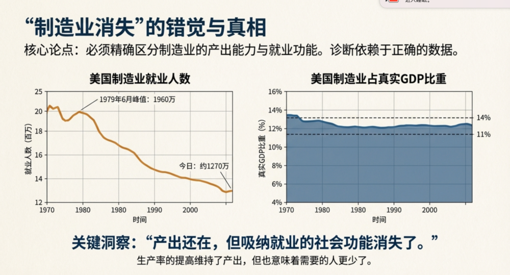 把这三组数字放在一起看,会得到一个更精确的结论:制造业并没有在美国“消失”,它的真实产出能力仍在,但它不再承担“吸纳多数人的社会功能”。